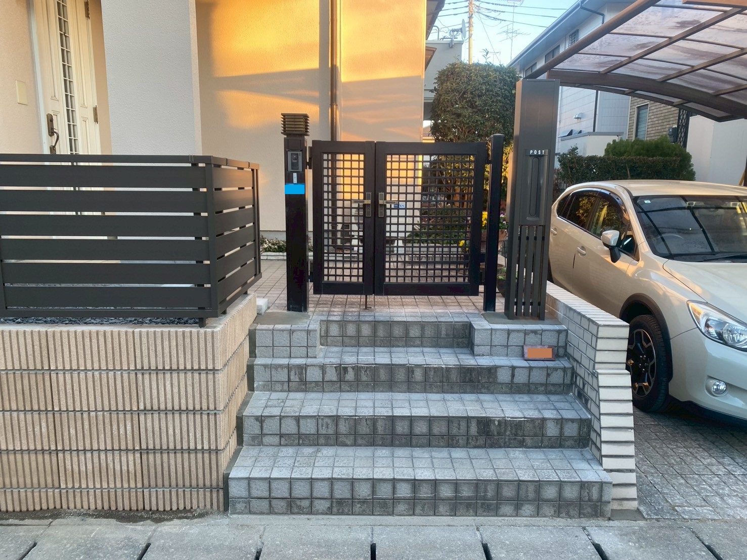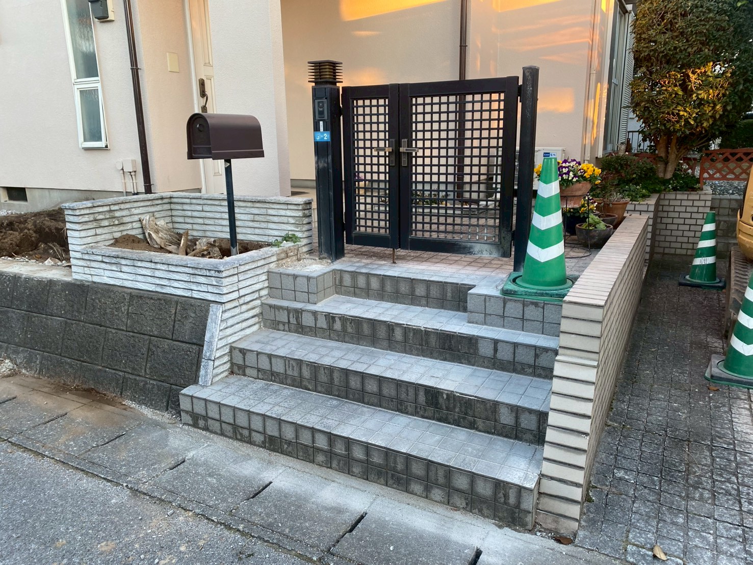 門扉左側のブロック塀と石段門柱を解体して、新しくブロック塀+フェンス、機能門柱を設置しました。